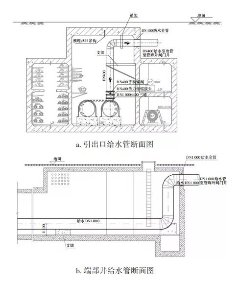 ③ 管道附屬設施可能與其他管線存在交互關系。關鍵節點設計主要包括引出口、端部井及交叉口管線設計。給水管道出入管廊部位以及穿越防火墻處需做特殊考慮。